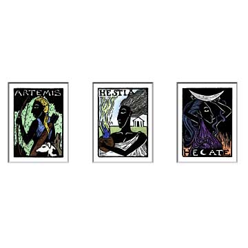 Artemis, known in the Latin as Diana, is goddess of the hunt, also the Maiden. Hestia is the goddess of the hearth, or the Mother, and Hestia is the goddess of wisdom, the Crone.