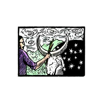 Very dreamlike and dream-ful. The brahma bull is a sacred animal/symbol, and here has moon horns and a galaxy of stars on his pelt. Marvin gives or receives a blessing.