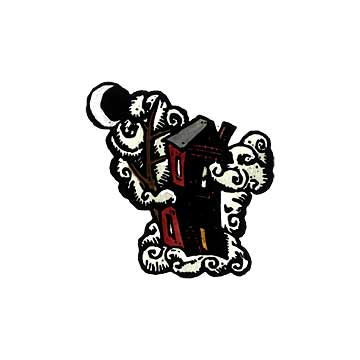 Tiny little linocut with the feel of a fairytale illustration. There is a larger 3-D version as well called “Cloud Witch’s House”.