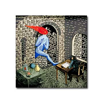 Faust made a deal with the devil, Lucifer, the Angel of Light. This piece was one of a series Marvin did for his graduate thesis exhibit. The originals were framed in deep wooden boxes and were very much more dimensional than the current versions. He realized it’s a lot easier to frame and carry around the illusion of space – and the later versions were very cleverly dimensional just not so deep and heavy.
