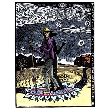 The figure in this piece and in the dream from which it sprung was Marvin and Not Marvin. Wherever the figure stood or walked there appeared a lotus flower, and one hand (the left of course) and one foot glowed with a silvery light. He also had a shadow figure attached to him, which made me think of Peter Pan whose shadow needed to be sown back on.