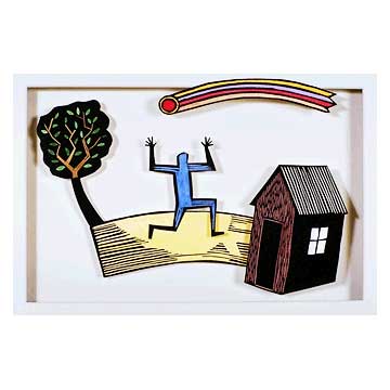 Somehow this little dimensional linocut is referring to the story of Chicken Little, and I’m pretty sure it was a dream. He used this image on his business cards for years.