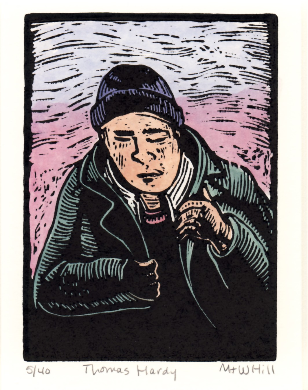 Sometimes Marvin would illustrate some idea or character from a book – he was reading Thomas Hardy when he carved this linocut, but I don’t know the story behind it. Perhaps you do??