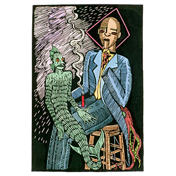 This piece is often framed along with the other 2 in the trinity: “Trinity Of The Starving Buddha” and “Trinity Of The Shroud”. They were dream images that came one after the other one night, perhaps after eating General Zho’s chicken, as Marvin would sometimes attest.