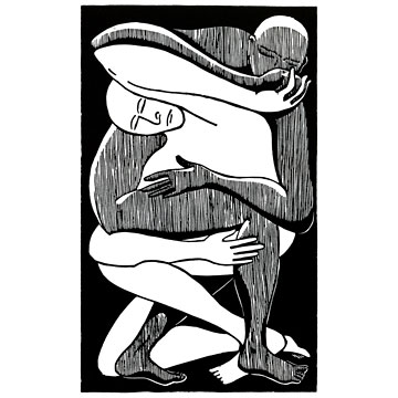 This woodcut was first titled “Doubt”, and sparked very little interest even though we both felt the image was strong and interesting. I finally asked Marvin what he was thinking when he created it, and he said it was about the struggle we all have to embrace both the light and shadow aspects of ourselves. These elemental factors may seem to be in conflict, but in truth are 2 halves of the same whole, and each must be in balance with the other.
