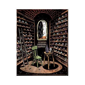 Here is one of the few actual commission pieces Marvin ever created. We got a call from a woman who had bought several things from us at the Atlanta Arts Festival — her husband had just finished a wine cellar in their basement, and she was hoping Marvin would make a special image for him to commemorate the event. We discussed what she hoped to spend, and she was agreeable to any design Marvin came up with. He was only interested in commissions if he was still allowed to be creative. We also knew the image would probably be popular, so he agreed and made this sweet little lino cut.
